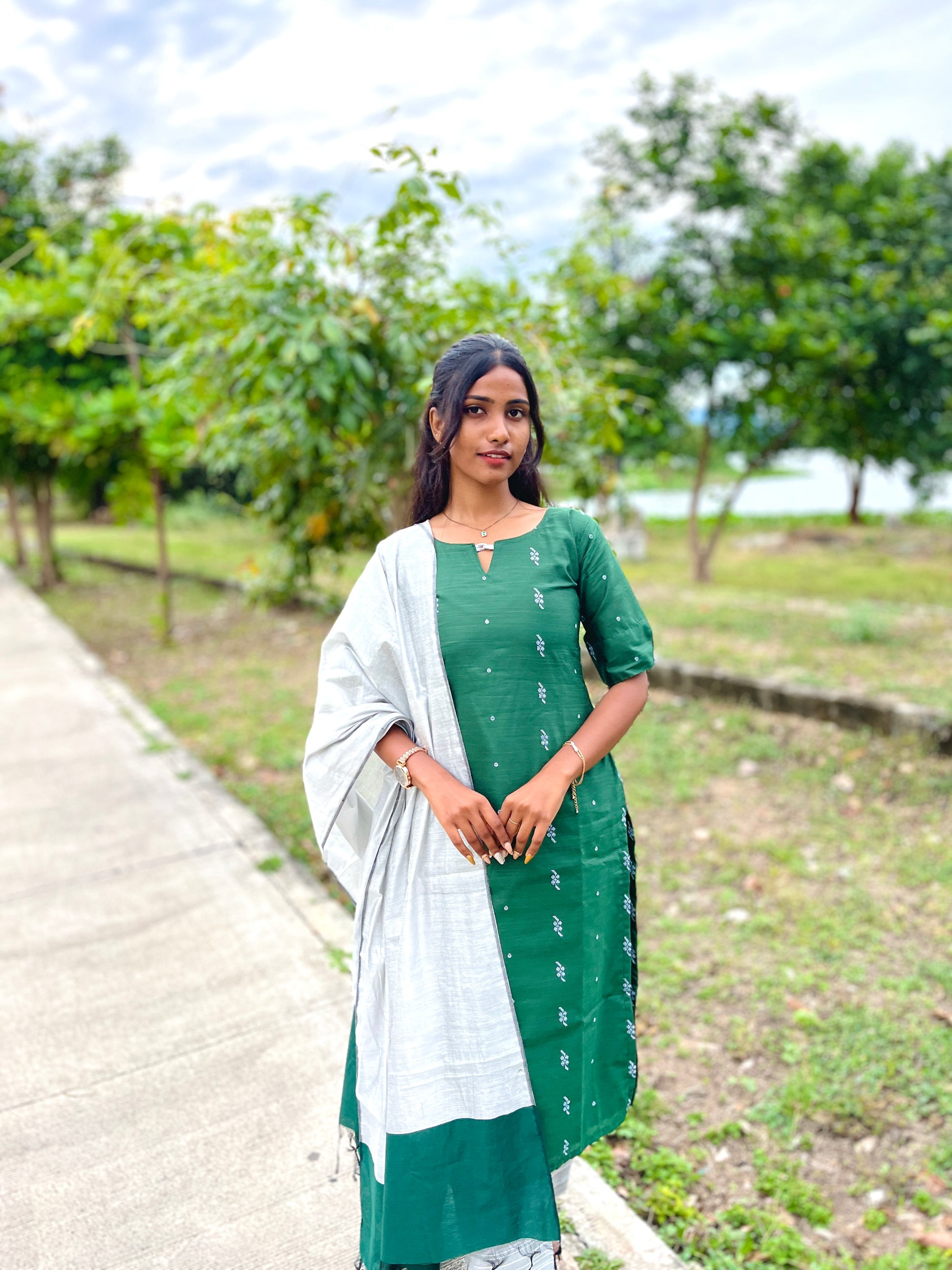 This cotton kurti set features a handloom fabric combined with a comfortable lining, offering a soft and breathable experience for daily wear. The attached lining enhances structure and ensures smooth draping, making it ideal for extended use without discomfort. Paired with a matching dupatta, this set balances traditional craftsmanship with modern comfort.
