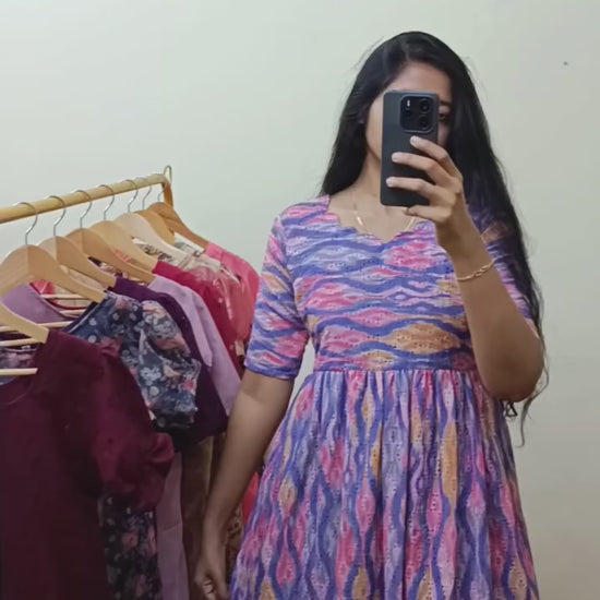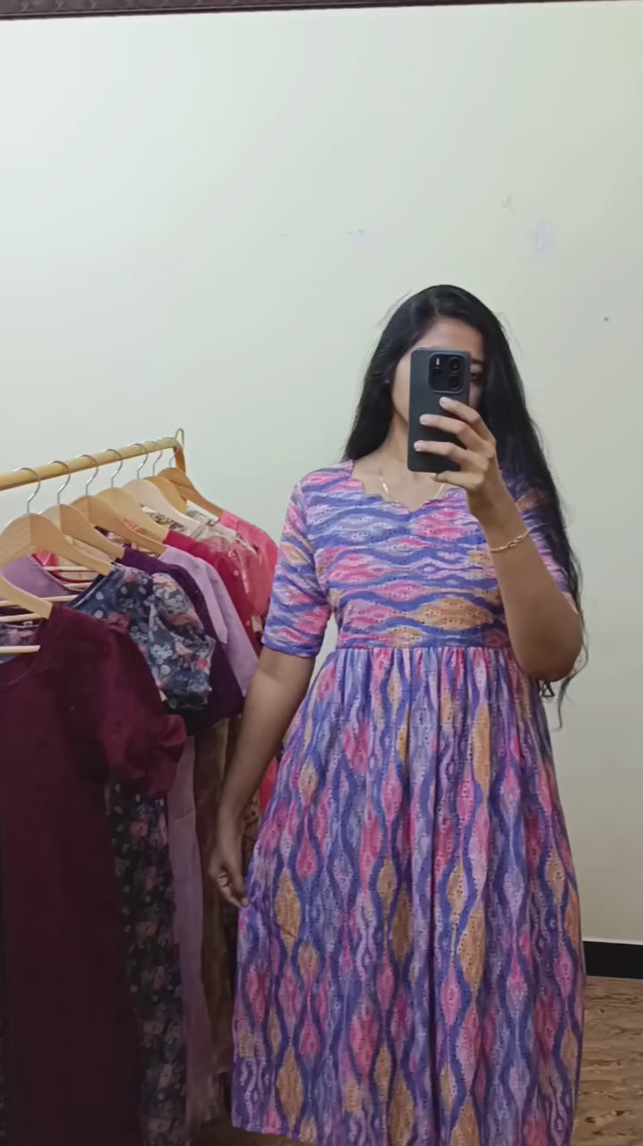 Expertly crafted multicolor cotton hacoba maxi dress featuring a convenient back knot at the waist for adjustable fit. Designed with practical pockets to secure essentials while on the go. Available in both feeding and non-feeding styles, making it a versatile addition to any wardrobe. The premium cotton hacoba fabric ensures breathability and comfort throughout the day.