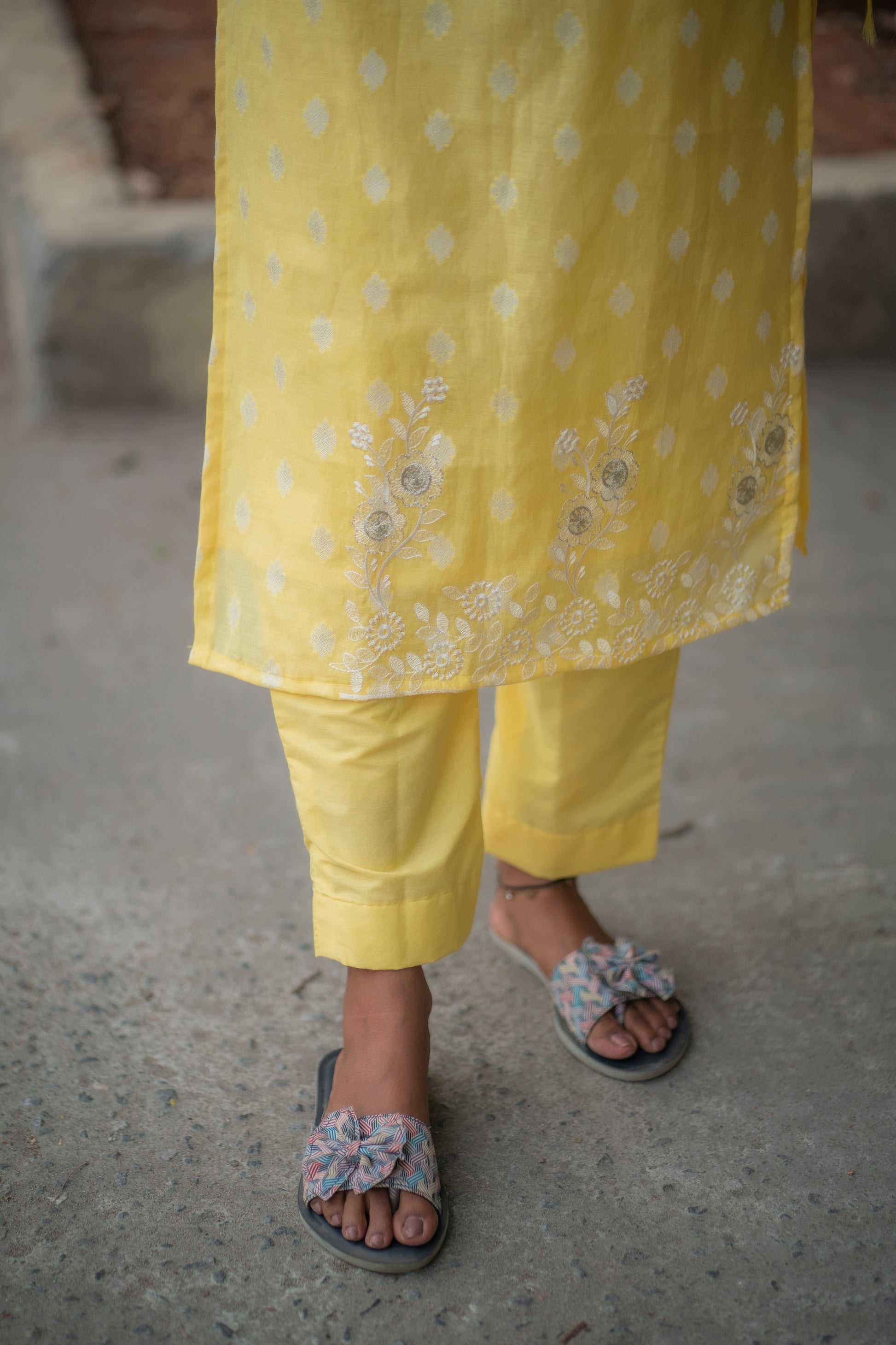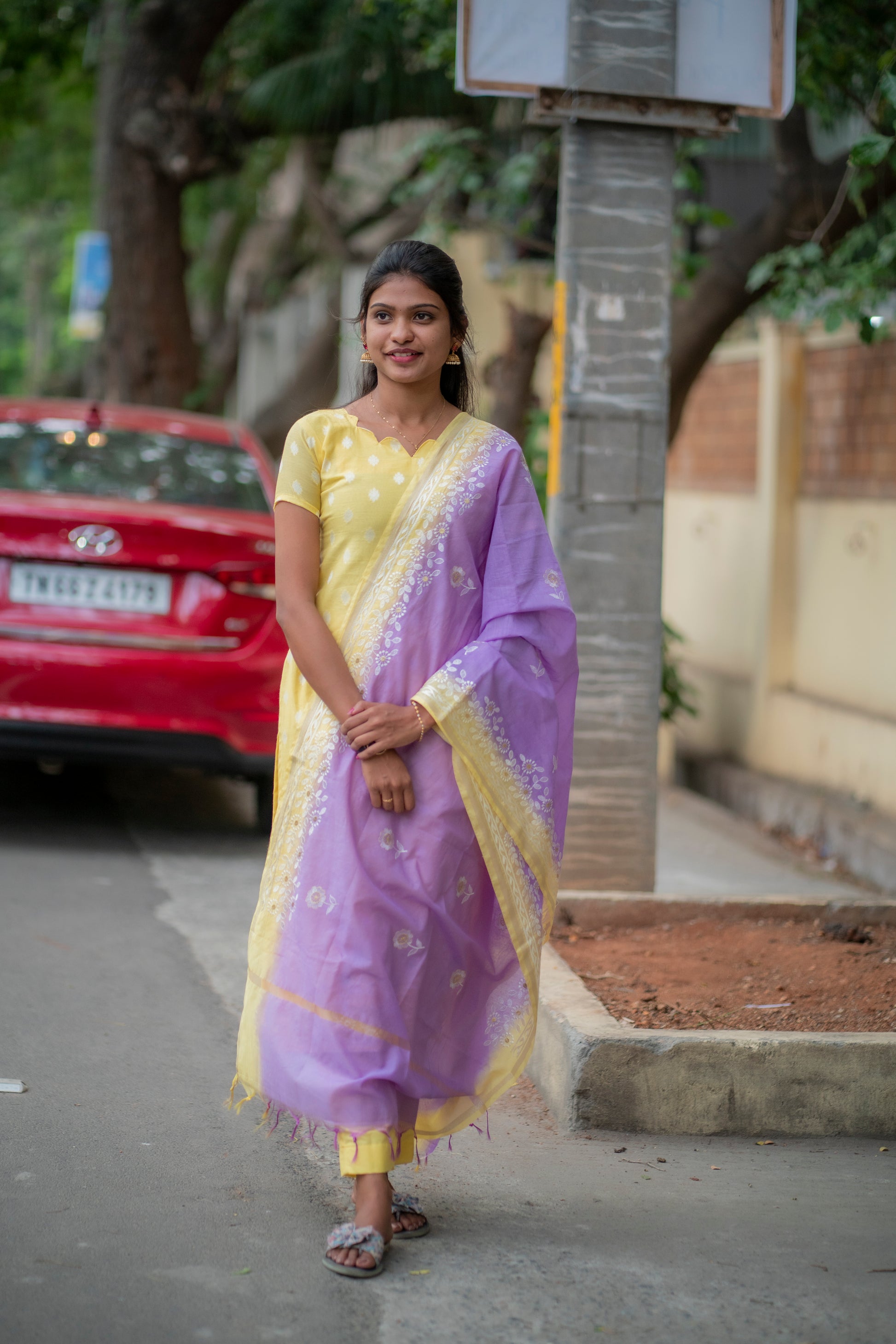 This premium Chanderi cotton three-piece set features a finely embroidered dupatta, a comfortable cotton pant with practical pocket, and a top with scallop neck detailing and attached lining for added comfort and coverage. Crafted from high-quality fabrics, this set combines traditional elegance with everyday functionality, making it an ideal choice for sophisticated, effortless wear.