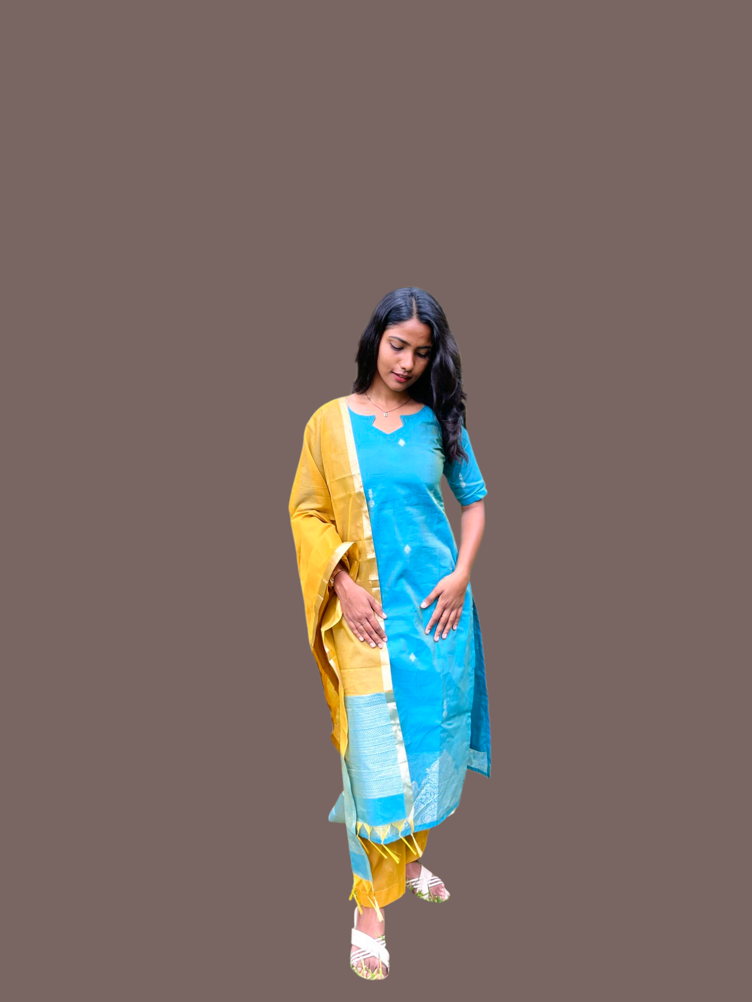 Experience elegance with this premium Chanderi salwar set, featuring a kurti, pant, and shawl enhanced by intricate zari detailing. The set includes a carefully attached lining for added comfort and durability, ensuring a graceful fit and refined look. Perfectly crafted for traditional occasions or everyday sophistication, it blends heritage craftsmanship with modern wearability.