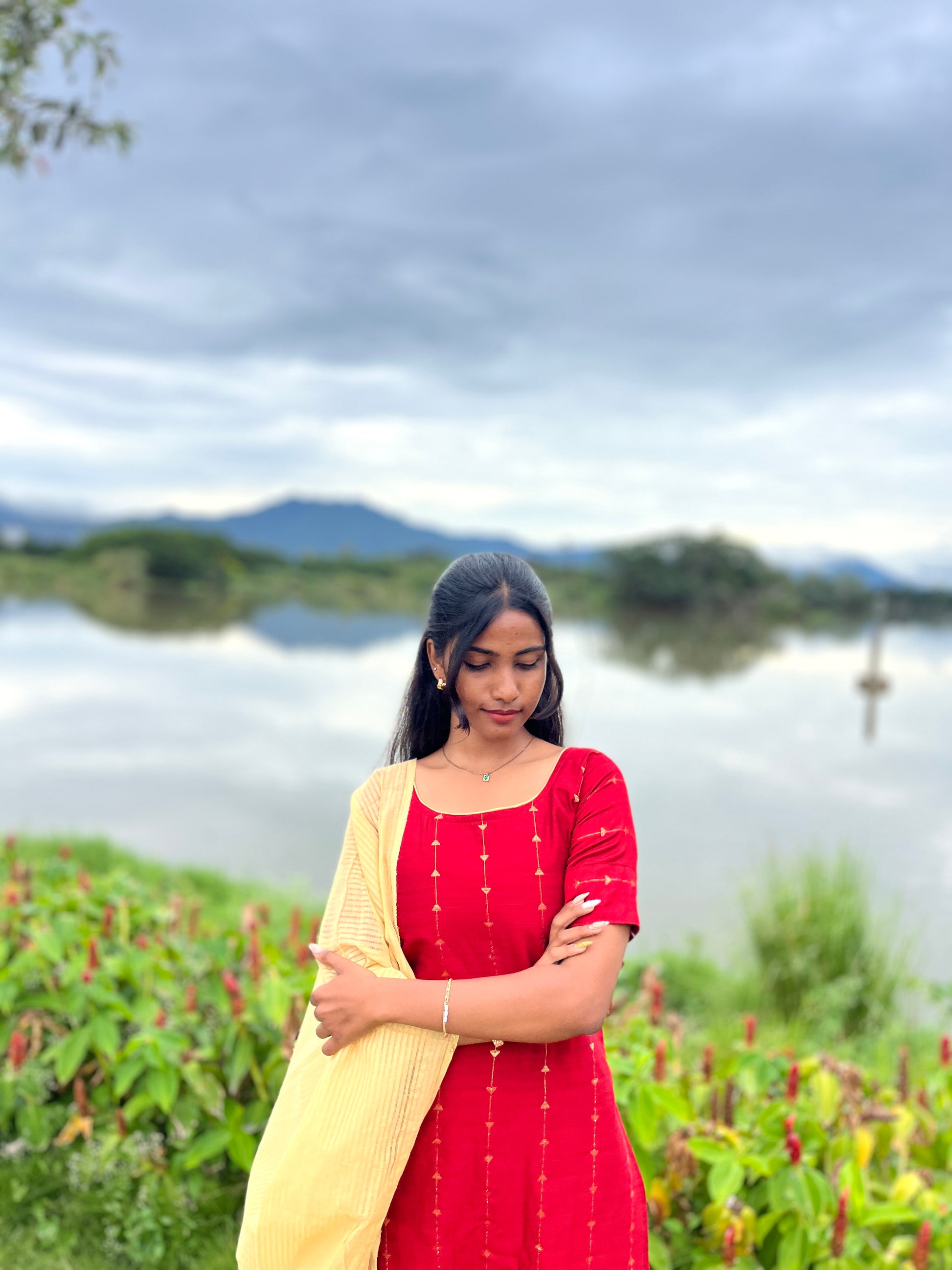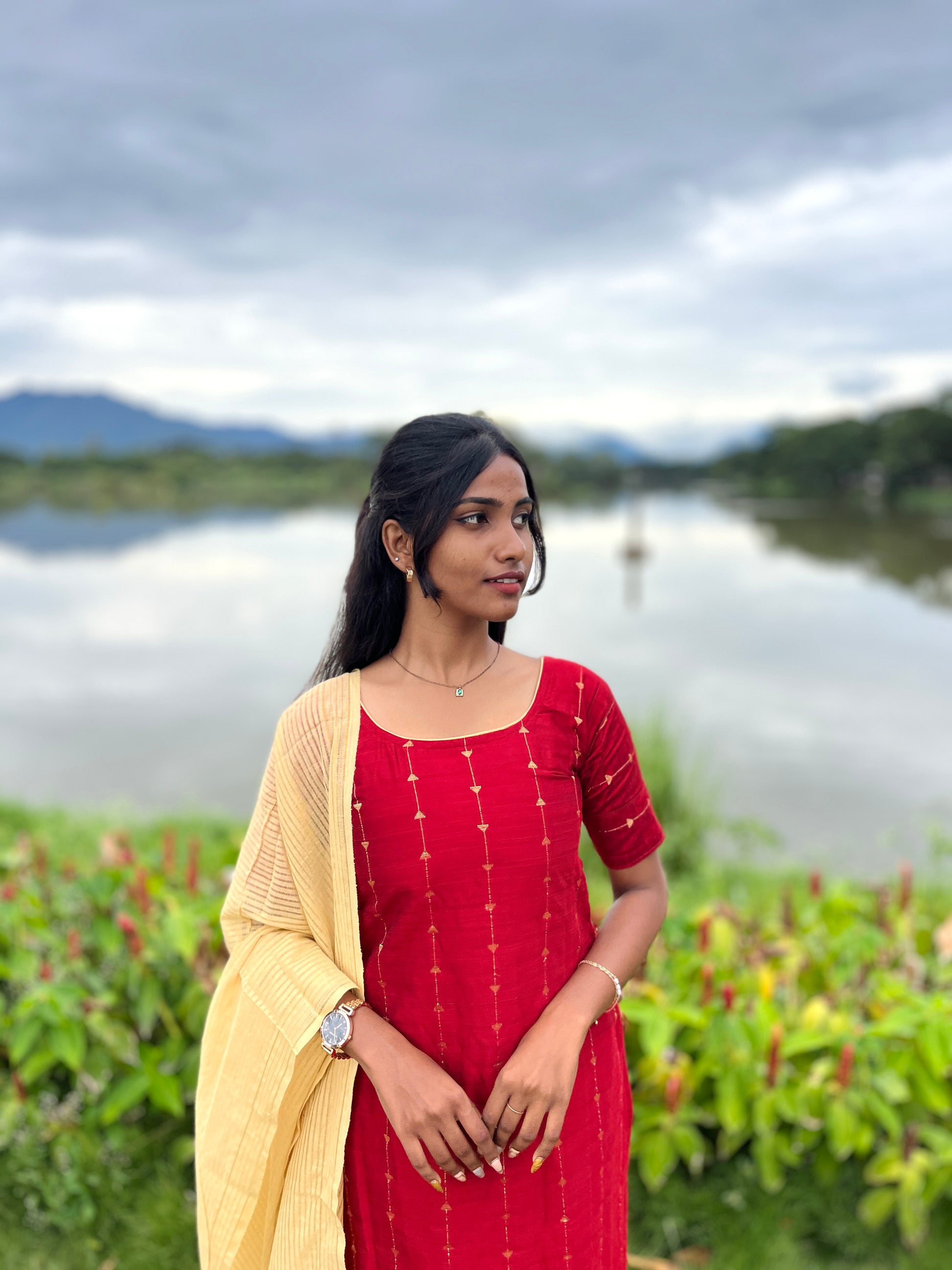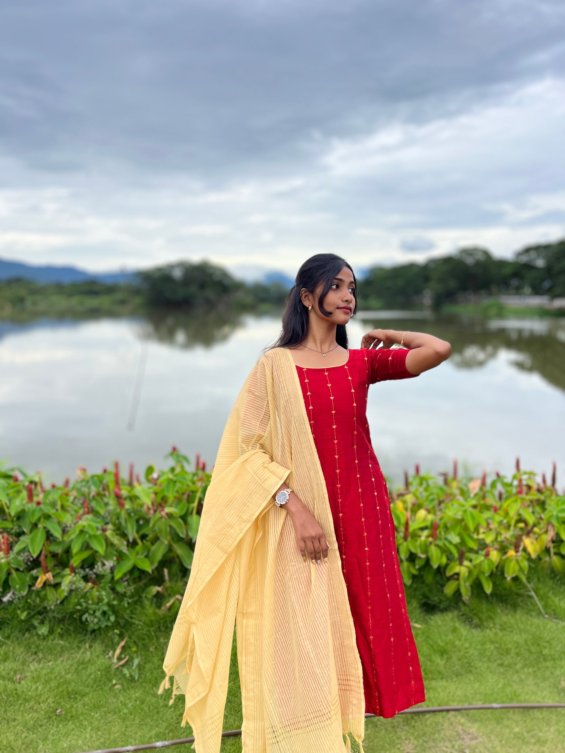 This premium raw silk suit set features intricate zari work on the kurti, enhanced with a comfortable lining for a refined finish. Paired with breathable cotton pants and a soft cotton shawl, it offers a perfect blend of elegance and comfort suitable for formal occasions and festive wear.