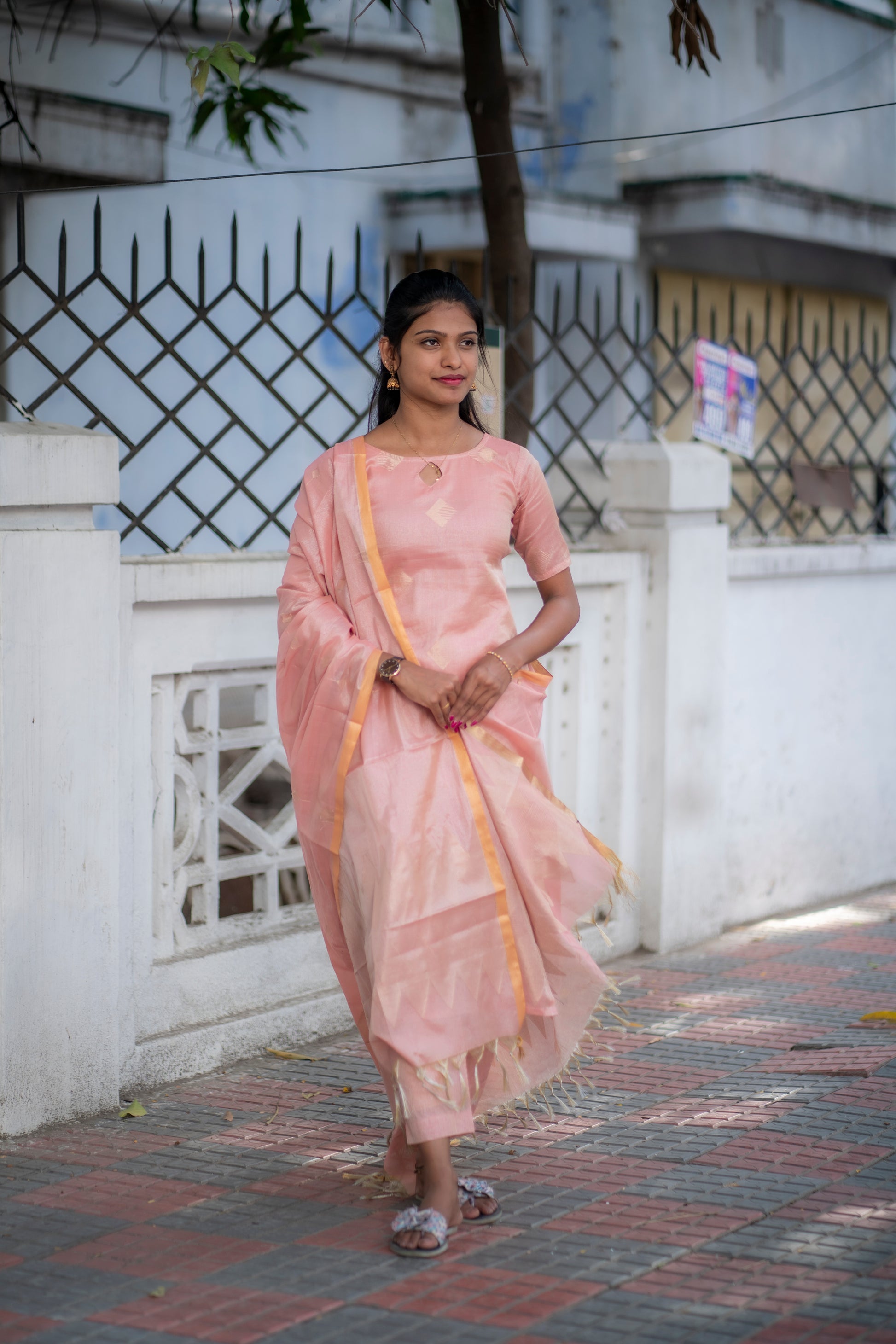 This premium salwar set features a finely crafted tissue kurti with an attached lining for added comfort and structure. The matching pant includes a convenient pocket, combining style with practicality. The ensemble is completed with a coordinating dupatta, offering an elegant and cohesive look perfect for various occasions.