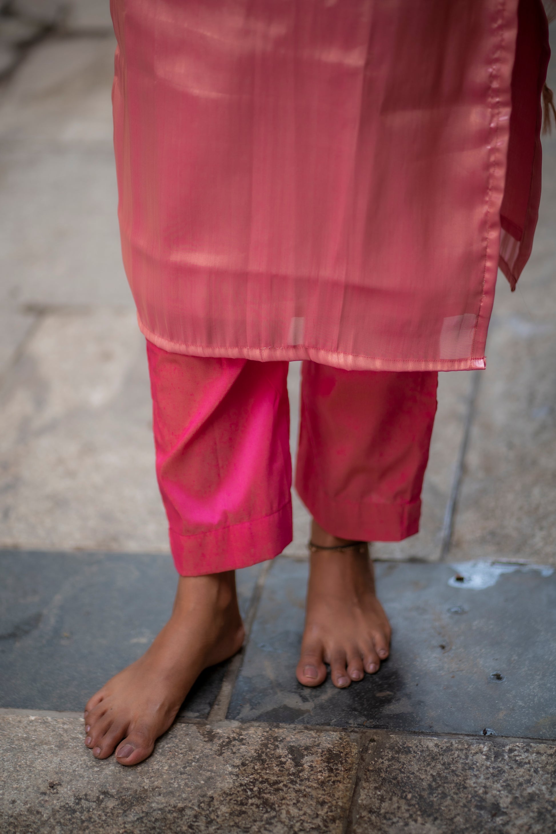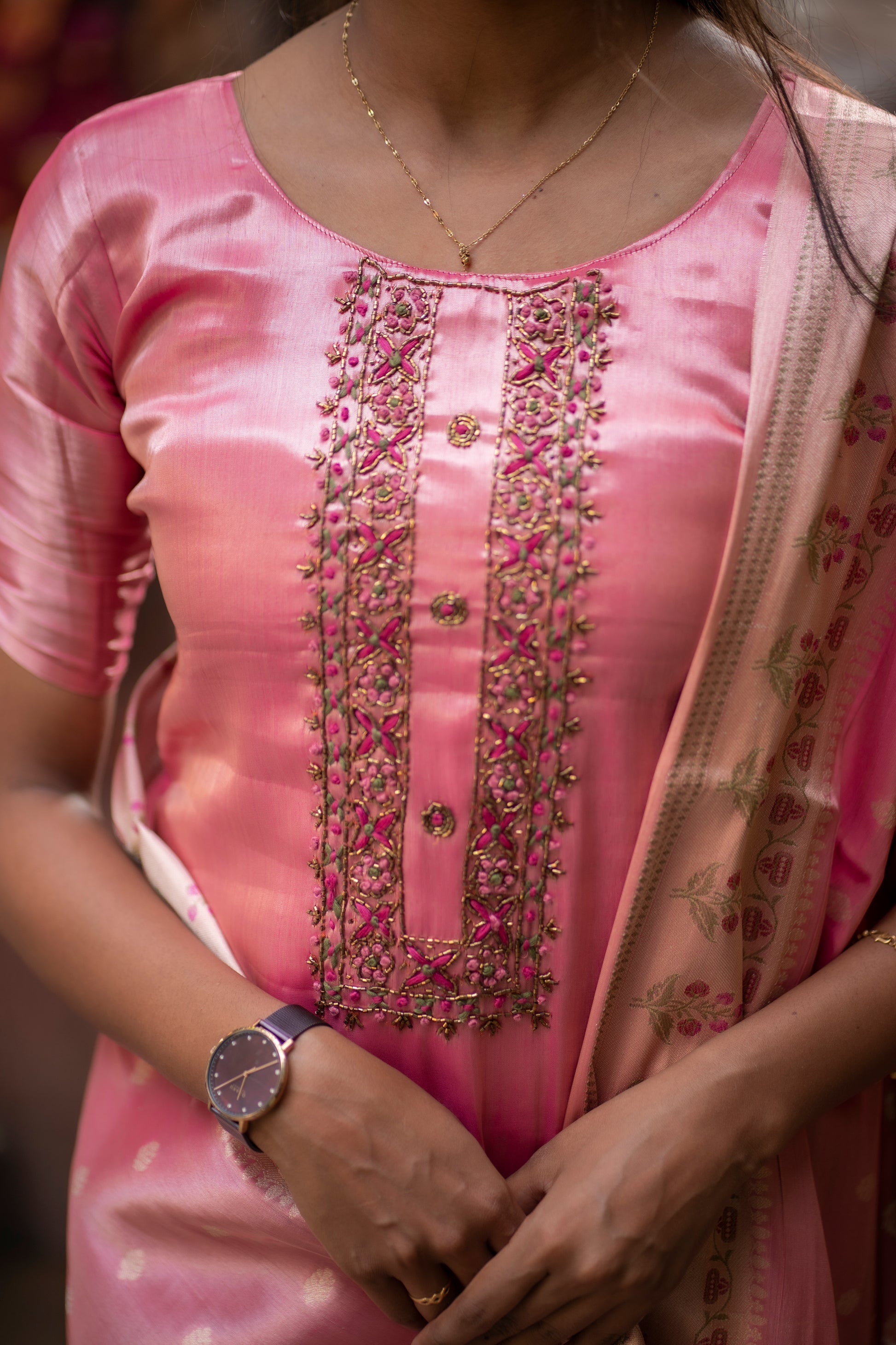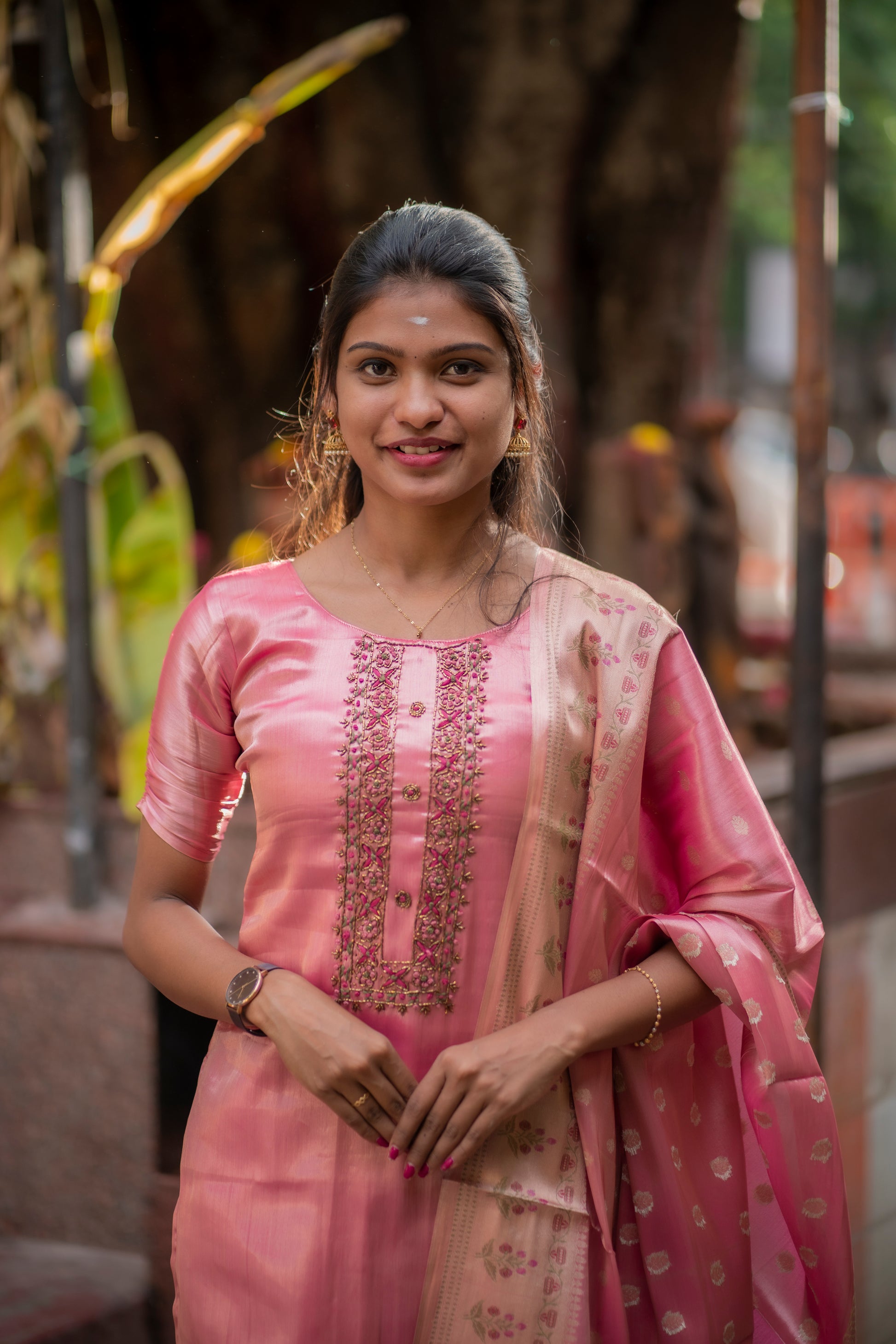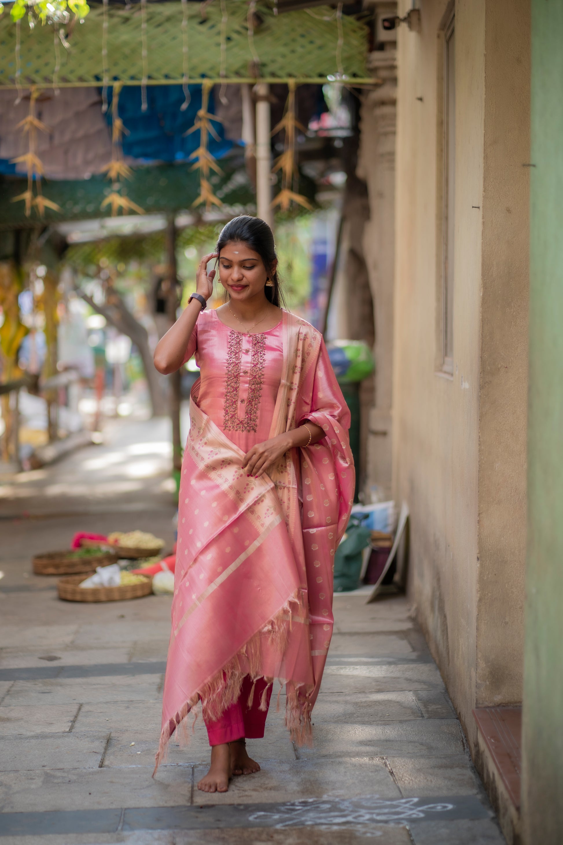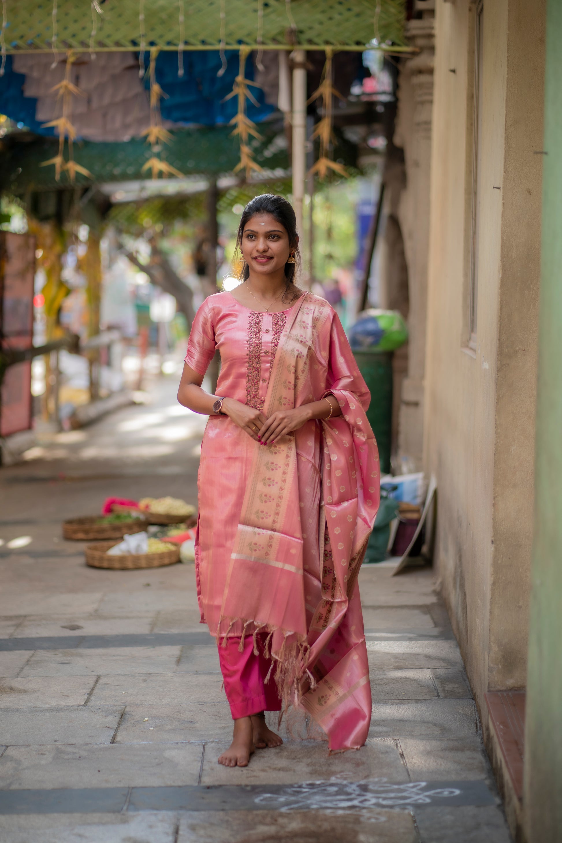 Elevate your wardrobe with this premium tissue silk three-piece set, featuring expert craftsmanship and refined details. The top showcases a designer neck design with attached lining for comfortable wear. Complemented by a silk dupatta adorned with an elegant Paithani border, it adds a touch of traditional artistry. The matching pants include practical pocket combining style with functionality. Perfect for special occasions, this set blends luxurious fabric and thoughtful design to ensure a sophisticated, polished look.